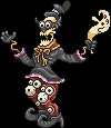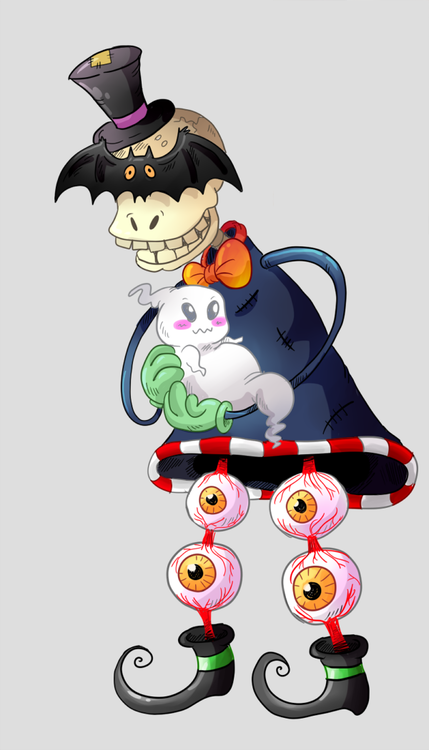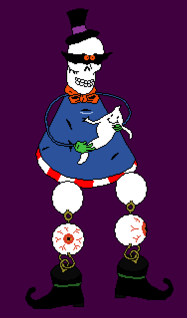 This grotesque creature looms as tall as an ogre, its upper body appearing as a skeletally-thin humanoid figure. Its face is shrouded by a ragged piece of skin shaped like a pair of membranous wings, from which glare burning orange orbs. Below the waist, two fat tentacles grow, each of them studded with dozens of lidless eyes. It is clad in a motley of garishly colored fabric, tailored into a crude costume.