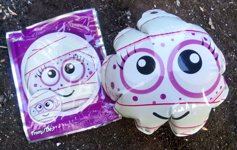 Speaking of mummies, there's a pretty good one included in this four-pack of tiny, foil balloons. When you smash one with your fist, it's inflated on its own by a chemical reaction that's probably highly toxic and not great for the ozone layer, but I'll just inflate one of them:$11 Spent: Monster Bobbleheads