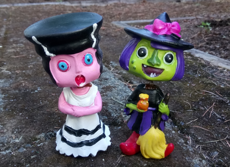 Speaking of lady monsters, these resin bobblers come in Werewolf, Vampire, Black Cat, Witch, and...the BRIDE of Frankenstein!?! JUST the bride!? Oh man, I don't think I've EVER seen her included in a set of monsters without her bolt-necked male counterpart around! Who would have thought a bunch of Dollar Tree figurines would offer a rare opportunity for The Bride to stand alone as the sole Frankensteinian representation!?Her design is the coolest in the whole set, too, with her ghoulishly pink skin, haunting moan and disturbing red-rimmed blue eyeballs. I just had to get one, but I wanted to get at least one more so she wouldn't be lonely, and I think the best choice was that adorable, purple-haired witch. The rest of the set is kind of underwhelming, except perhaps the cat, which I might grab sometime later. Then it can just be lady frankenstoid and purple haired witch, together forever with their really huge cat as nature intended.