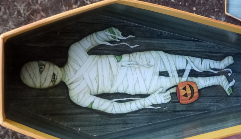 Speaking of me looking forward to things most people don't care about, these cardboard coffins have been a Dollar Tree staple since 2014, each available in three sizes and each with a surprise monster printed within.Perhaps the best thing about this mummy, however, if you look back up there at the lid, is that its arm comes off when you open the box. Oh my god, that's so damn clever!