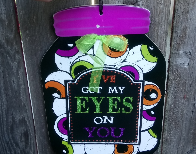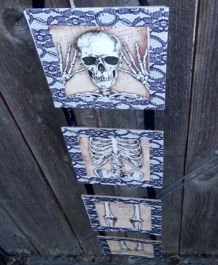 The phenomenon of wooden signs shaped like jars is one that I've only become aware of since last year, and this is a fine use for it. Eyeballs are definitely one of the top five things you can keep in jars, and I love the messy, hand-painted aesthetic of this. The purple lid is also really pleasing, and the ghostly green bow ties it all together. I'd expect to see this at a Michael's or something for at least fifteen to twenty bucks.$3 Spent: Multi-Panel Skeleton
