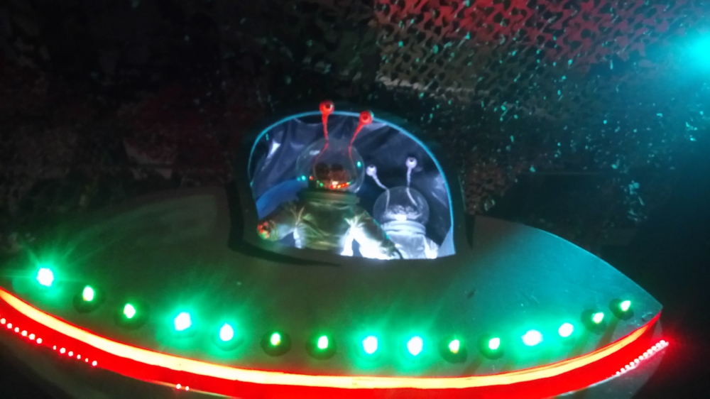 Next was a room featuring precisely three things: an angry farmer actor with a shotgun, a life-sized statue of a cow, and this hovering U.F.O. occupied by the most wonderful little brain-headed alien visitors. Unlike most "hillbilly" style Haunt characters, the shotgun wasn't even meant to scare us visitors; he just threatened and blasted at these little guys as the entire cow lifted into the air. Now that's what I'm talking about. A haunt that really puts on little "shows" more than it seeks to startle people the easy way.