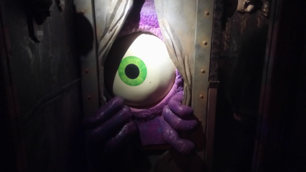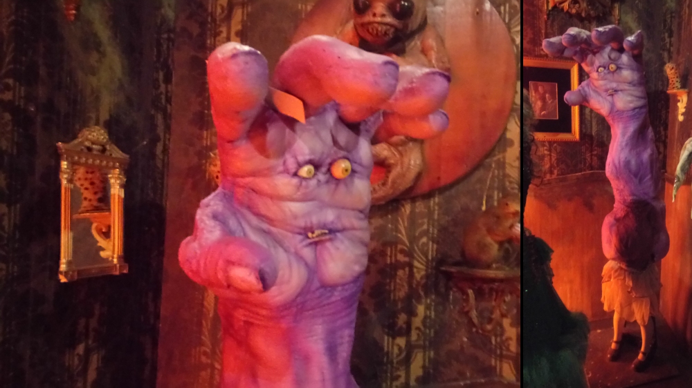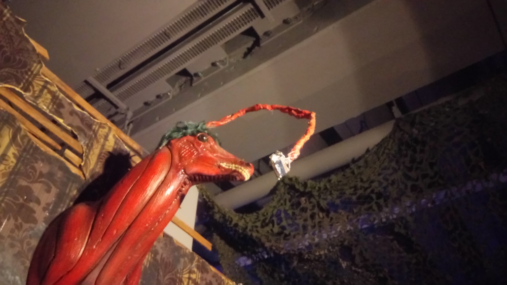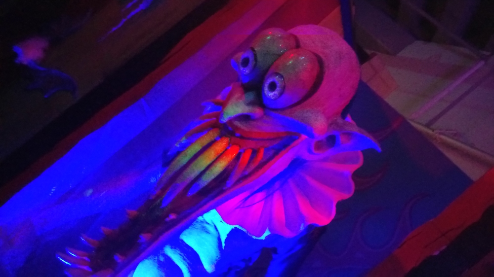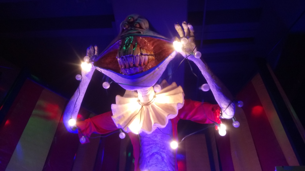 This larger, gorgeously detailed mutant clown only moved back and forth near the ceiling, but its very design communicates an illusion of movement. Together with the ever-shifting shadows cast by the string lights, you can almost see those three eyes darting around and gummy throat pulsing.