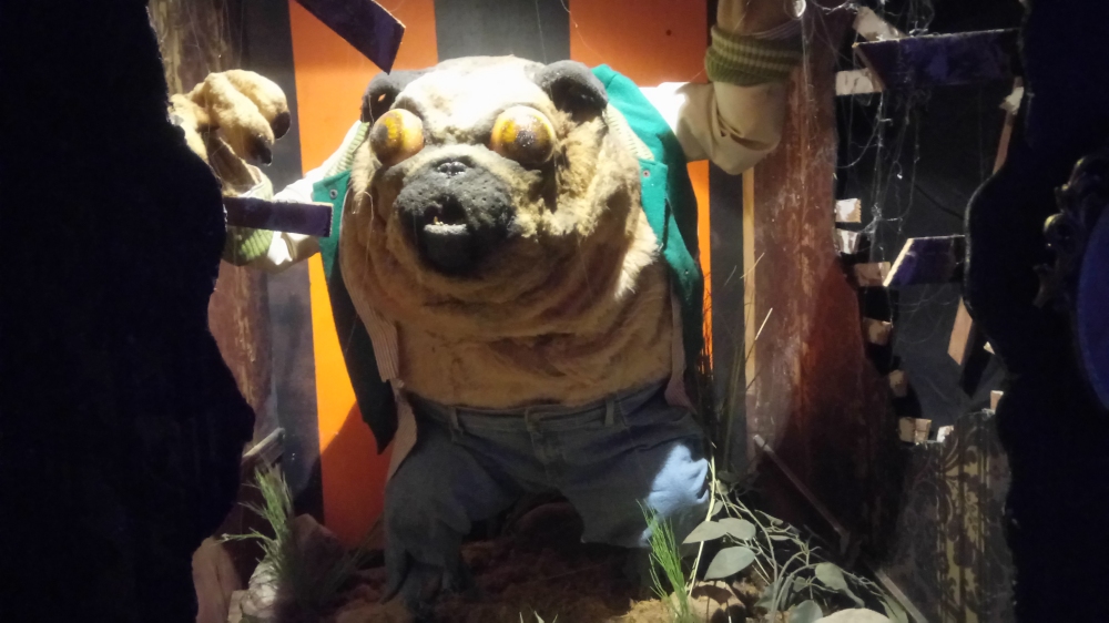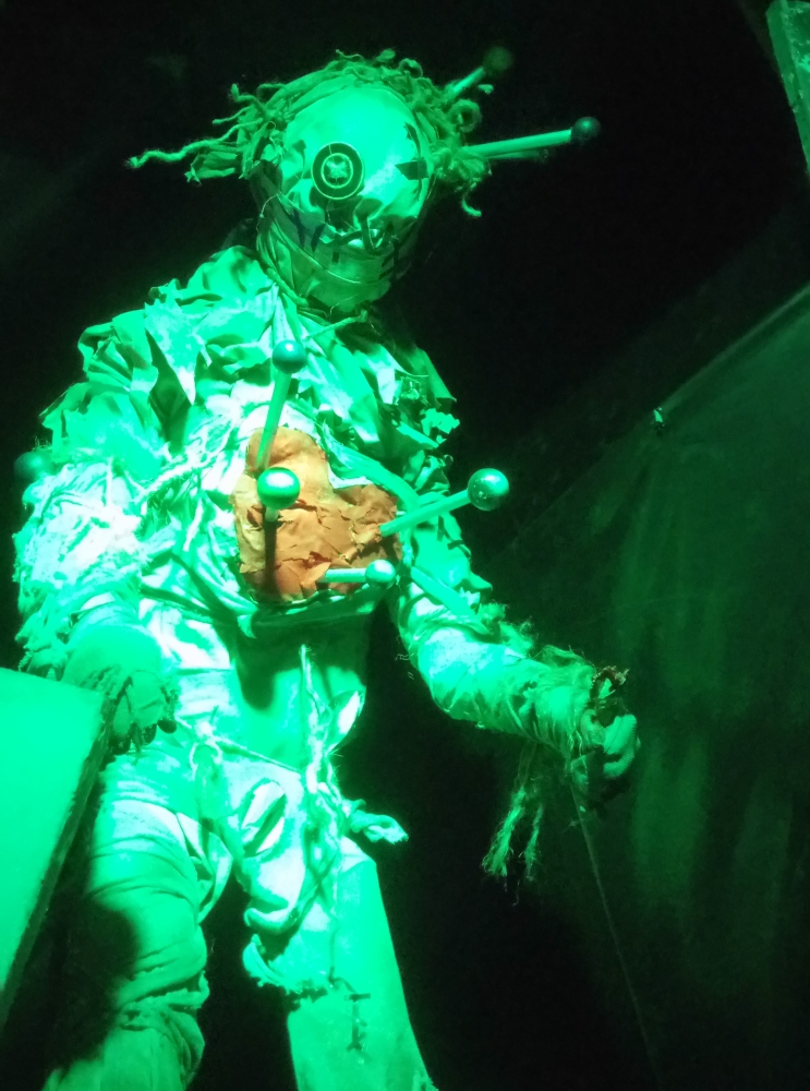 A pumpkin demon easily ten feet tall told jokes at the arena entryway. The giant voodoo doll above burst screaming from its hiding place, and the Museum of Horrors exited into a fully convincing "back room" full of spare costumes, broken props and half-finished decorations...until a life sized dinosaur head burst from behind a clothes rack.