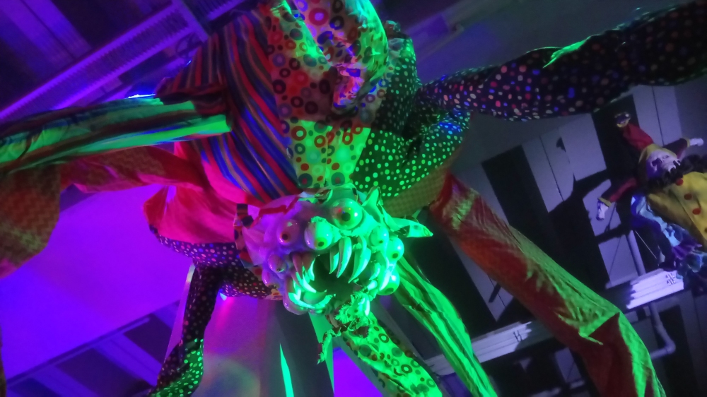 None of these goofs could have prepared me for the sheer majesty of the very largest clown in the haunt, a spider-clown with a dozen eyes and fangs I couldn't possibly have designed better myself, gangly arms stretching clear across the ceiling with an outfit seemingly patched together from multiple human-sized costumes!
