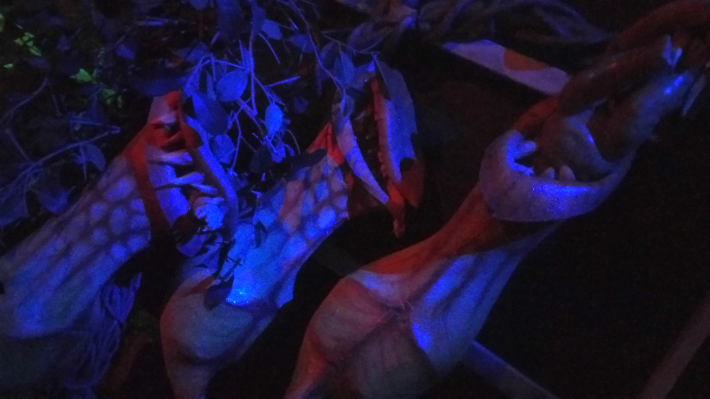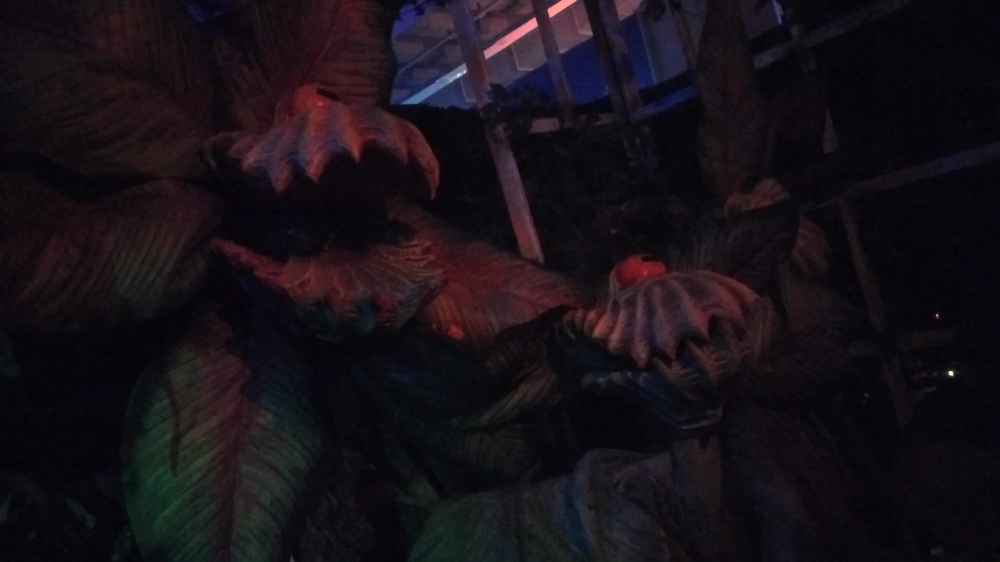 These beautiful one-eyed fly-traps, meanwhile, hid an entire animatronic plant-man impossible to film in the dark. Sorry you keep having to take my word for this stuff, but I'm already enthused enough about these static plant critters, and I hope you're enjoying them too. Look at that beautiful ribbing between their teeth!