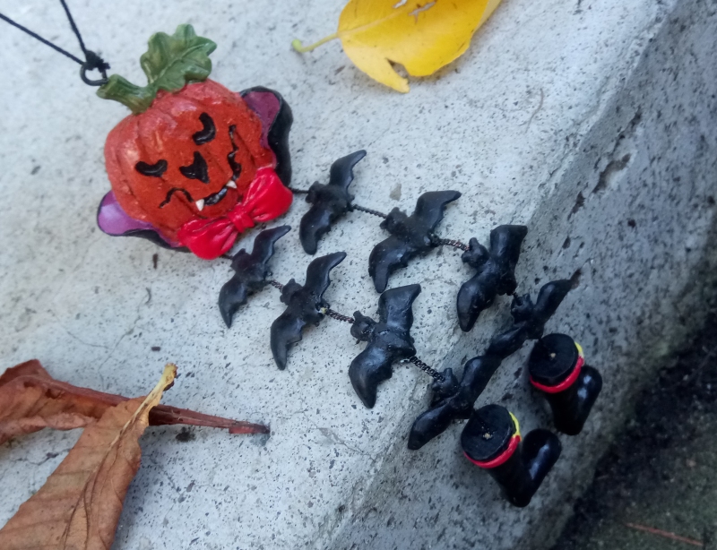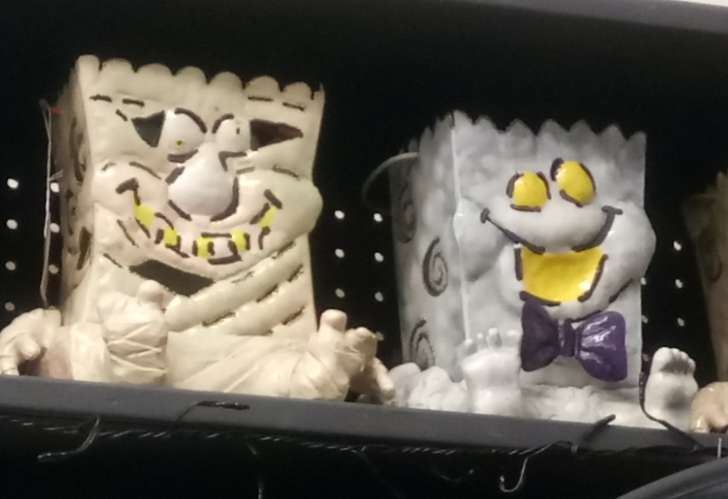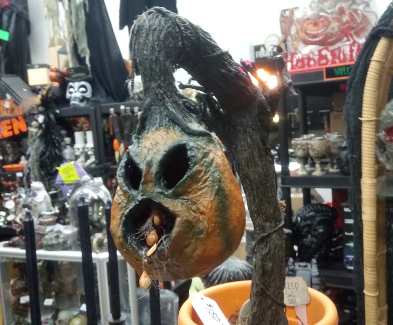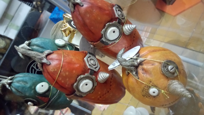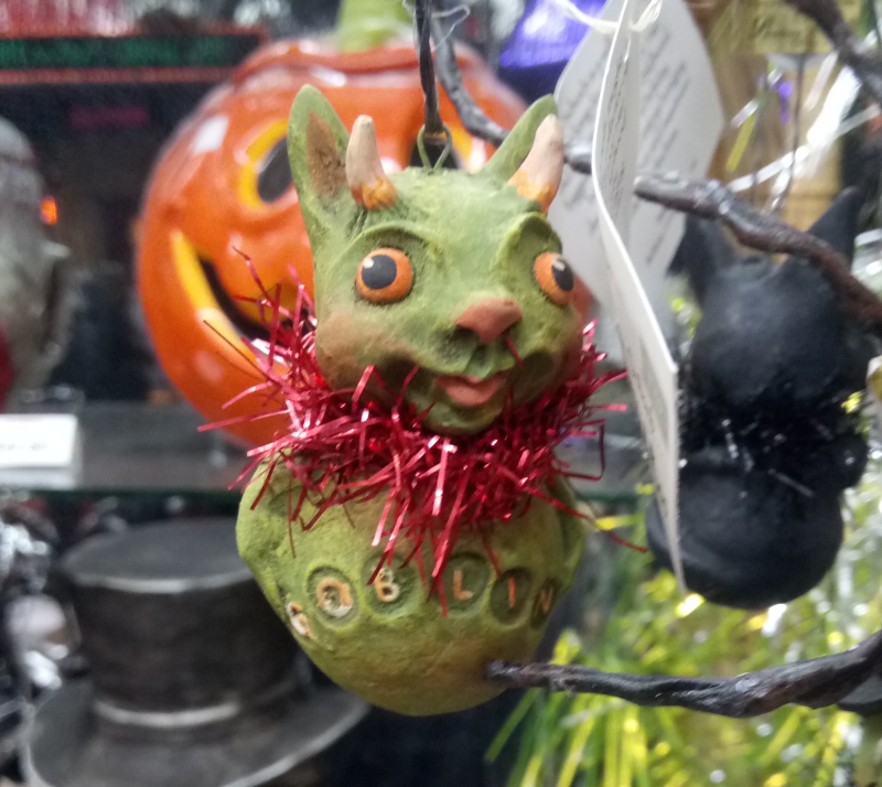 Last but not least and another one I went home with, I want you to really, really take some time to admire the design of this little tree ornament. Really soak it in that this is not only a vampire pumpkin, but a vampire pumpkin with two giant, long legs somehow formed by a flock of disconnected bats and a pair of boots. How does THAT work?! Bats and boots just hover in place and it all somehow not only holds this pumpkin up, but allows him to locomote?! This is, I dare say, approaching Skilevak levels of magnificence.I think a demonstration is in order, too.