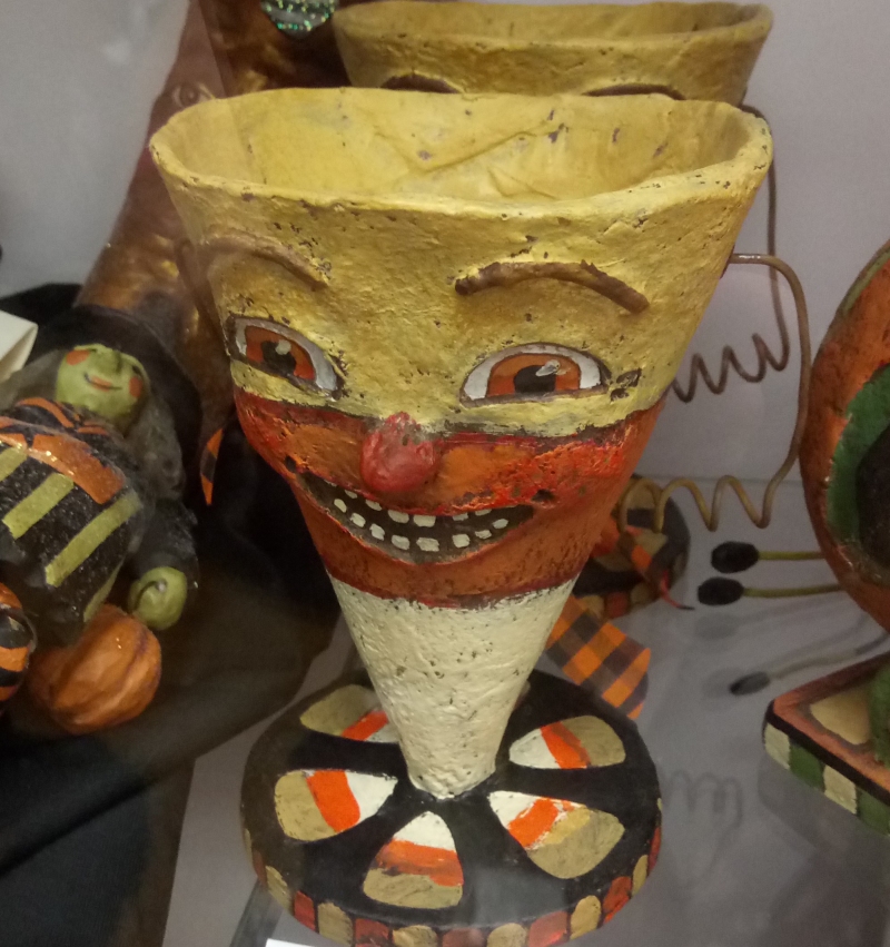 Purely decorative and not really usable as a pail, but that doesn't mean you can't put something in this Sugar Fiend's hollow top, such as actual candy corn, if you don't mind potentially staining an expensive, retired collectible with corn syrup. Isn't that probably exactly what this spirit would want? Look at his face. He can't wait for you to fill his cavity with the one and only thing he cares about.Spooky Dinosaur Cupcake Holder