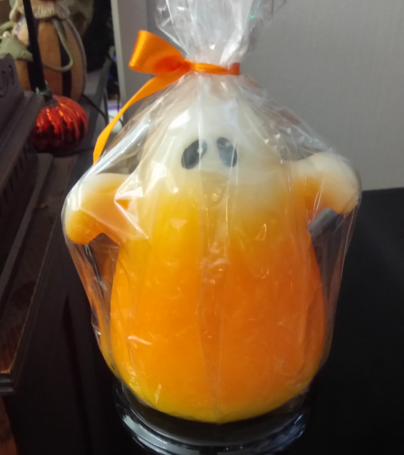 This is the exact same top-hat-wearing owl skull as seen on a smaller figurine I reviewed last year, but apparently they also made and sold enormous, disembodied head versions.Candy Corn Ghost Candle