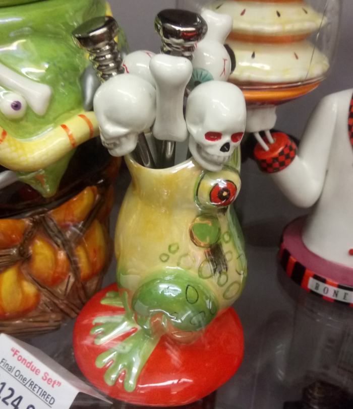 In my excitement to photograph this spooky fondue frog, I neglected to get a photograph of the actual spooky fondue pot that goes with it. You can see part of it to the left, but come on, dig that frog! It's a perfectly normal frog, really, but it manages to look just a little more ghoulish than the real thing even without a bunch of magically shrunken human bones in its mouth.As the price tag indicated, this was the last of these fondue sets available, and if you want it, you'll have to not only fly over here to Oregon but shell out several hundred dollars.
