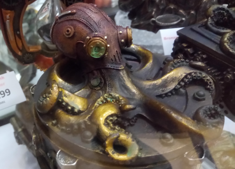 Pumpkins with completely human faces actually creep me out the most of all pumpkinkind. When I was a kid, they even sold ultra-realistic ones made out of soft, squishy foam rubber that became kind of a fad for a while.Steampunk Octopus