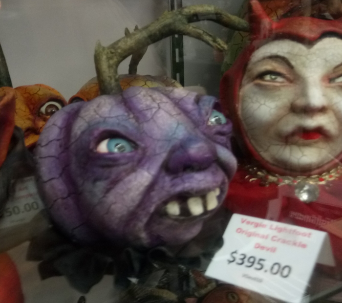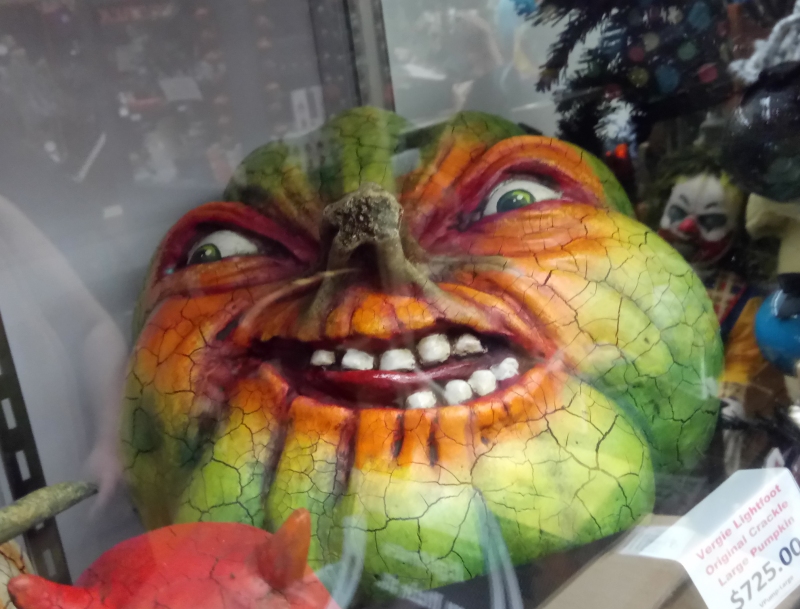 The artist behind this incredible one-of-a-kind sculptures sells almost exclusively through through Ghoul Gallery, and while I was impressed enough by last year's selection, they really do keep getting better and better. Check out the amazing mouth structure of the middle rear specimen, the anglerfish-like face on the left, and that excellent potted vine!Another of the potted variety was for sale indoors, barfing pumpkin seeds that look a liiittle like they wouldn't stay attached forever, but it would still look gorgeously grotesque even without them!