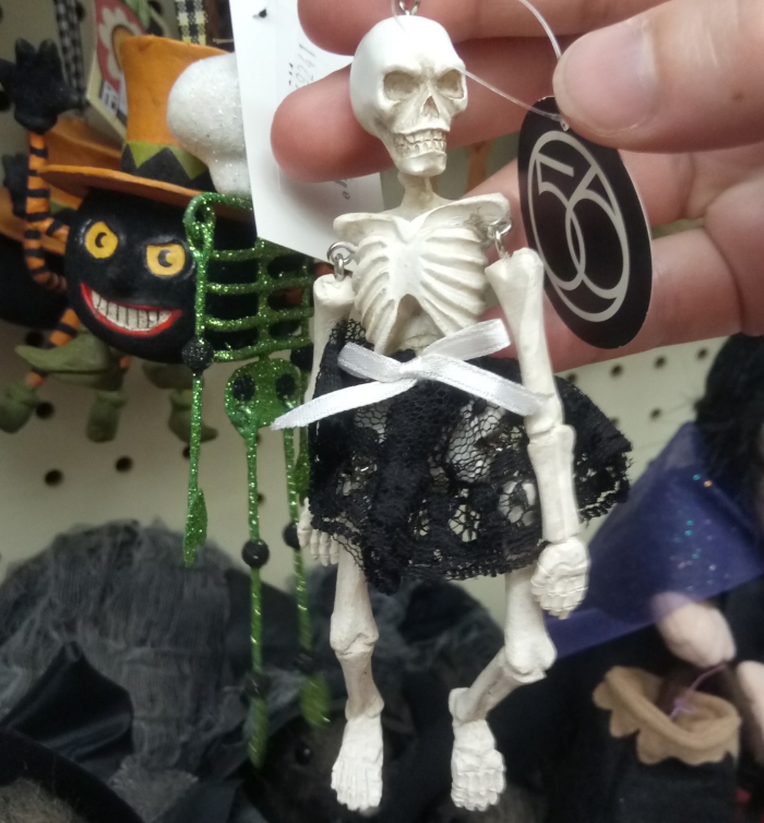 Definitely related to some other witches we've seen, like the spider-legged Esmerelda from Troutdale General Store the other week, only this witch is like 60% head with little, tiny eyes and a huge pointed beak of a nose. It's a great design, just inhuman enough to be interesting but not too over the top.Skeleton in a Black Tutu