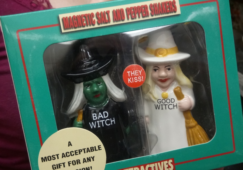 Unfortunately, it turns out that a magnet only holds these witches together side by side, so the sticker promising that "THEY KISS" might have been stuck there from some other, unrelated set of shakers. I will, however, fully accept the canon of whoever did so.Pseudo-Crow Sculpture