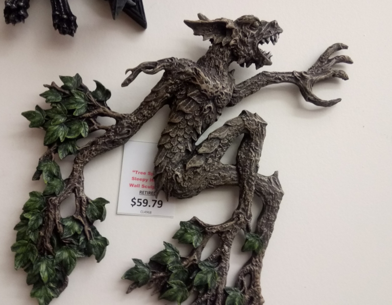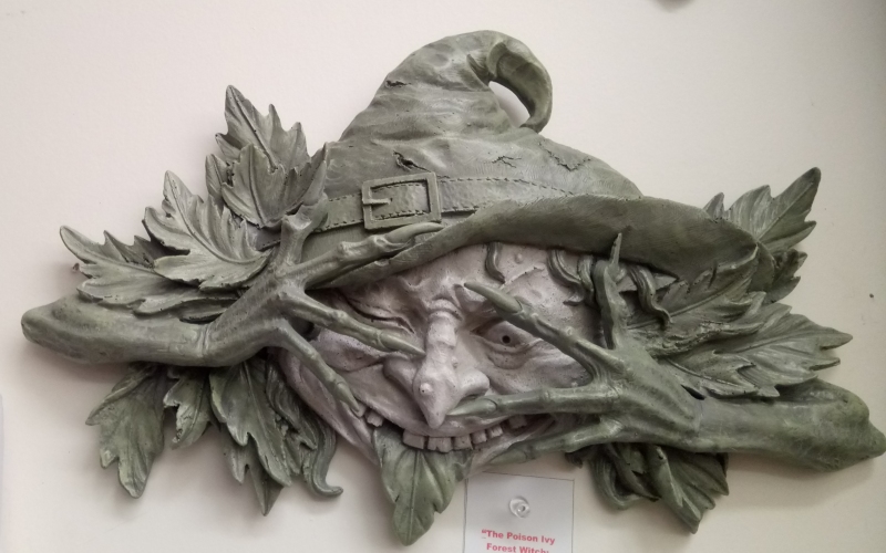 Speaking of gobliny thingabobs, this kickass botanical imp feels like a steal at only sixty bucks; inexpensive for this type of wall-hanging sculpture and for an item at Ghoul Gallery. I love how its legs and a single arm are fully leafy tree branches, or maybe it's currently in the process of shape-shifting between an ordinary shrub and a woody hobgob.The Poison Ivy Forest Witch