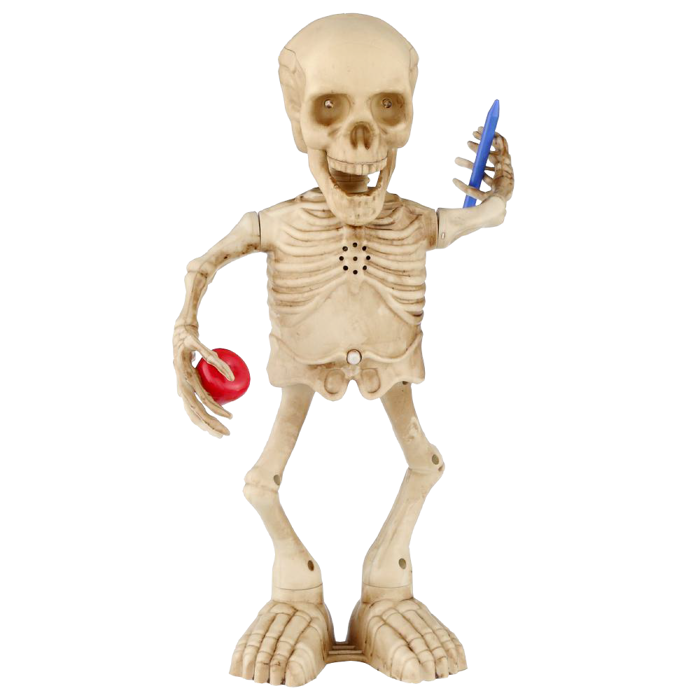 I'm gonna start with the most baffling, and the item I'm most curious to see in action. The website seriously called this a "pineapple skeleton" last I looked, but it's actually a skeleton holding an apple and a pen. I have...positively no idea why it would be holding an apple and a pen. Some kind of obtuse "back to school" joke? It looks like it lights up, makes noise and swings its arms around, desperately showing you its apple and its pen, which I suppose could be tied in, somehow, to whatever keeps its soul bound to our world.