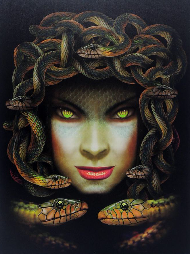 Always great to see something with Medusa, even if it's just a painting of her face on a fabric scroll with weirdly copy-pasted looking snake heads. Does anybody know what kind of snakes these might be? Artists don't always keep it in mind, but they clearly used a photo reference.