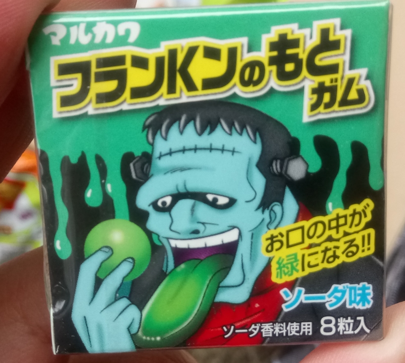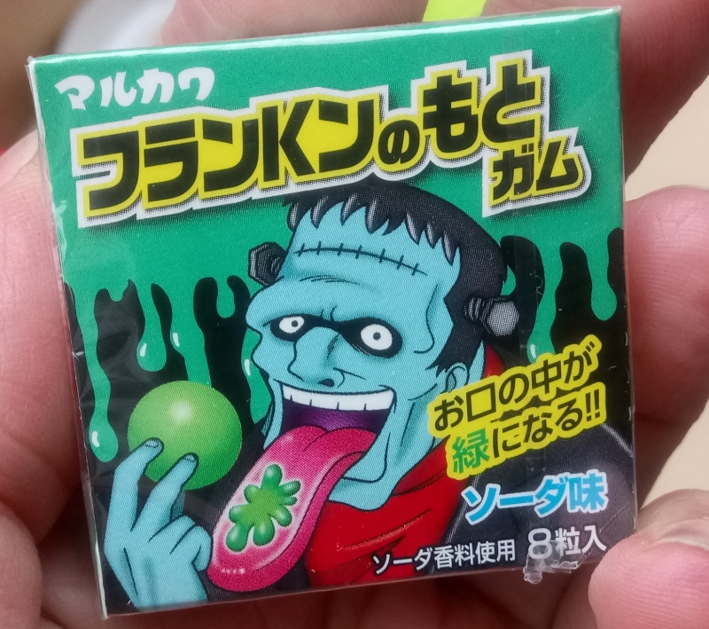 This is an adorably tiny little box with a simply beautiful color scheme; look at all that cool, dripping teal slime! These appear to be very small gumballs, or maybe they're some other candy, I don't know because I haven't tried to eat one yet, but they are almost alarmingly green.Unsurprisingly, these are also one of those candies that stain your tongue weird colors as a gimmick, which I always found kind of gross and unpleasant, but that would be exactly why a big dead guy is hocking them! The opposite face of the box shows us the aftermath, and it's kind of hard to tell if The Monster is impressed, disappointed, or just sort of puzzled by what he's gone and done to himself this time.