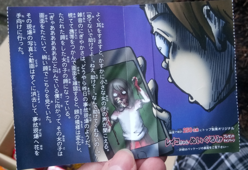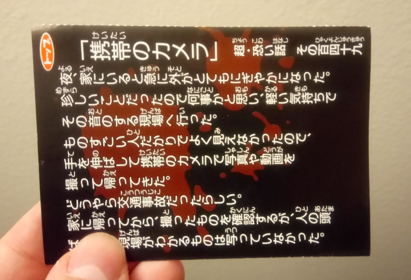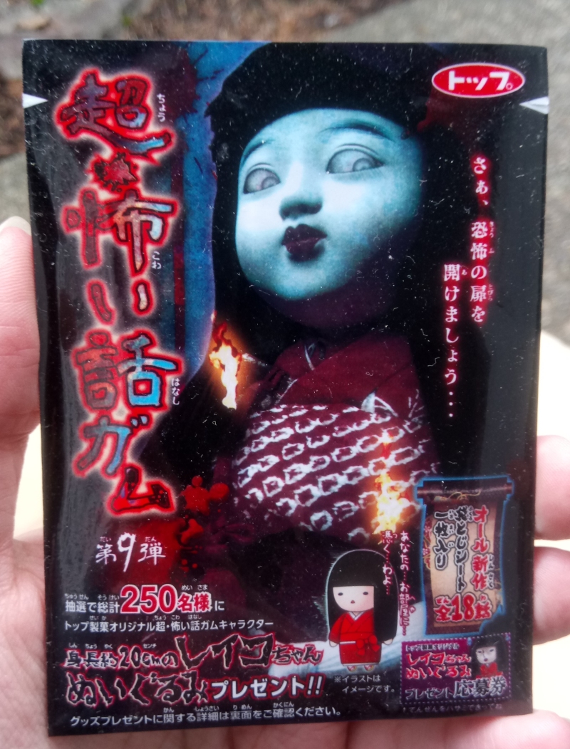 ...But, instead of trading cards, the packet contains only this folded, sealed piece of paper, covered in ominous writing. I knew almost immediately that what I was holding here was probably a ghost story, and I was right, since my spouse is able to read quite a bit of Japanese and was even able to translate the entire thing. The text on the outside of the slip reads as follows: