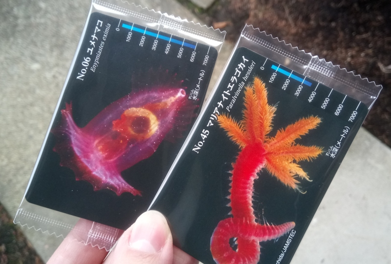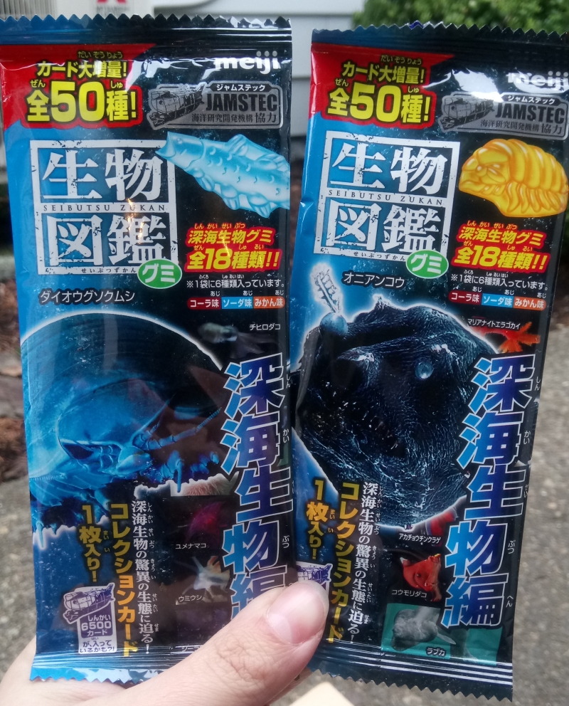 Even if I couldn't easily resist eating my new gummis, each pack is also kind enough to include an inedible memento; a randomized deep sea creature trading card! A handy little graph even tells you at a glance just how deep into the sea their respective animals dwell...and there's a lot of these cards out there, if "No.45" is any indication. I'm wondering if these gummis are the only way these cards are actually distributed, because that sure would be a lot of gummis to buy and eat your way through for a full set.