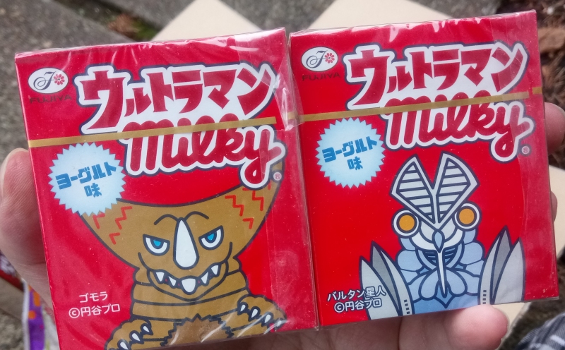 These boxes contain nothing but ordinary Milky brand candies, which are basically small balls of white, sugary cream, but that's fine. If they were shaped like Ultraman kaiju or otherwise thematic I'd never want to eat them. The box art is what matters here, depicting two of Ultraman's most famous and popular opponents!On the left we have Gomora, basically the all-purpose dinosaur-like Kaiju of the Ultra franchise, and on the right we have Baltan, the maniacal "space ninja" often recognized as Ultraman's archest of all nemeses, which isn't too shabby for a last-minute costume the studio originally modified off their cicada man.