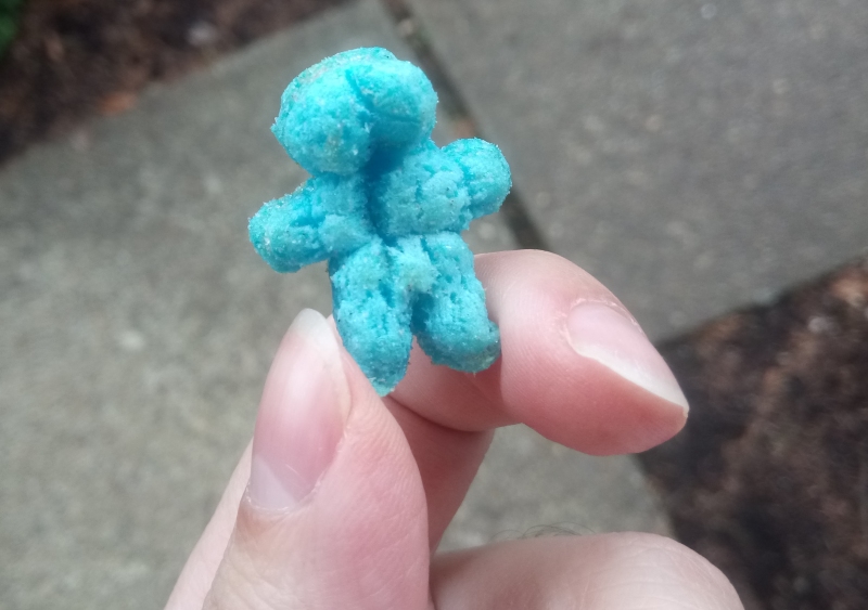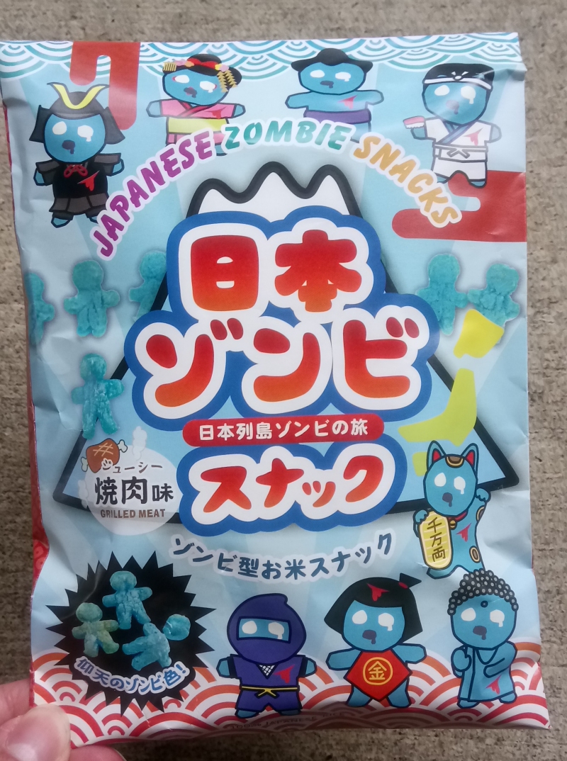 These are already adorable from the packaging alone. Blue might be my favorite color scheme for zombies, and I love the little drips off their eyes and mouths!The snacks themselves are nicely creepy little humanoid puffs of cornmeal, or something, and they positively REEK when opened...but they don't taste all that bad. It's an artificial beef flavor, so you can really feel like you're eating crunchy hunks of old, rancid undead flesh.