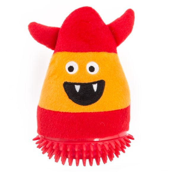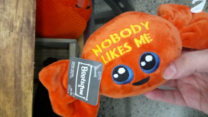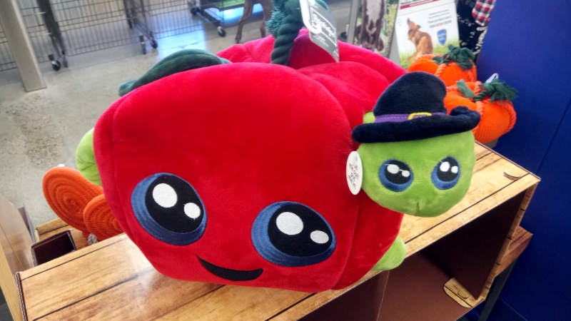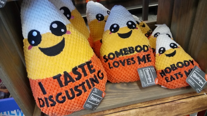 Petco's thing lately seems to be stuffed dog toys of food items, usually with happy faces and heartwarming messages on them. These candy corns retain the happy faces, but 2/3 of their messages are self-loathing. They are also entirely untrue, candy corn does not taste disgusting and you're wrong to think so. I guess maybe they're happy because they're hoping they won't get eaten, except their friend in the middle there who's totally into that.Witchy Wormy Apple