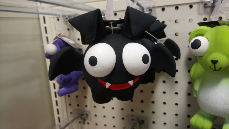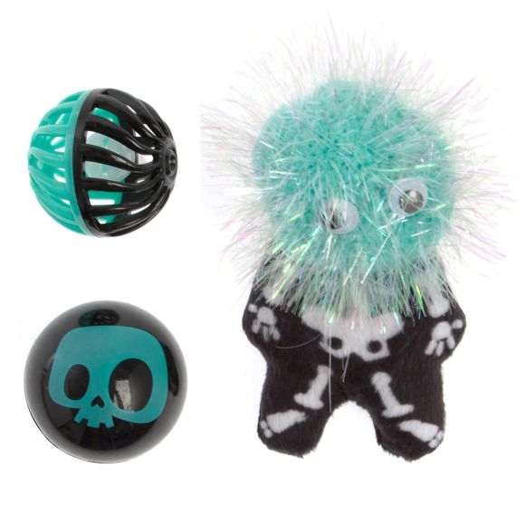 First up are these catnip toys sold in a set. The balls are humdrum, but you gotta love a skeleton whose head is a giant ball of blue hair with googly eyes. What in the world kind of monstrosity are we looking at!? It's like it has a big giant germ for a head.Thrills & Chills Bat