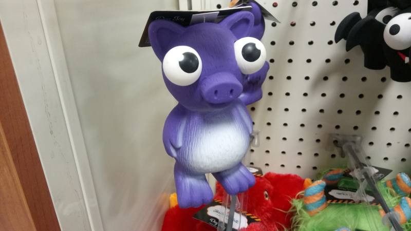 This is part of a line of vinyl squeaky toys with "pop-out" features. In this case, the bats ears flap every time it's squeezed. Why the ears and not the wings? An unexpected choice, but cute as hell, and it kinda looks a little like the Dracky from Dragon Quest.Thrills & Chills Pig