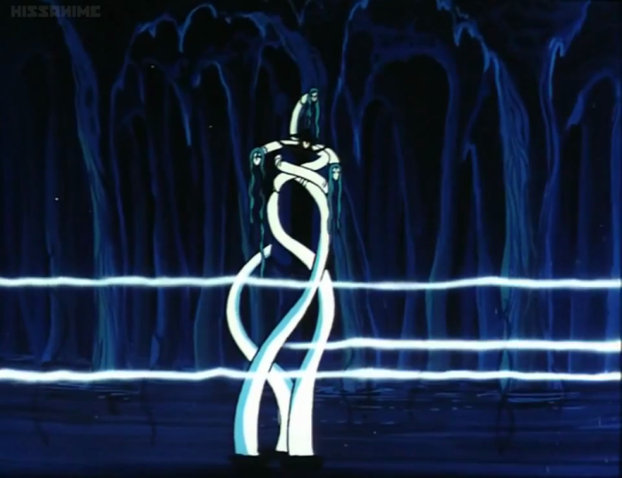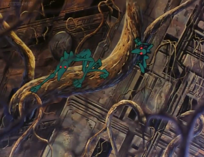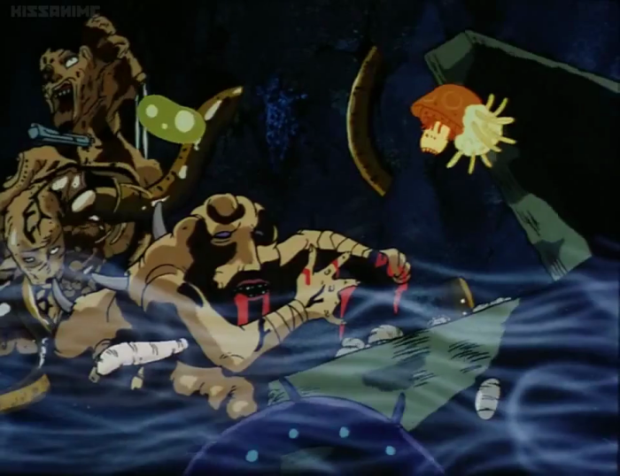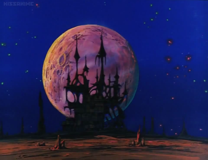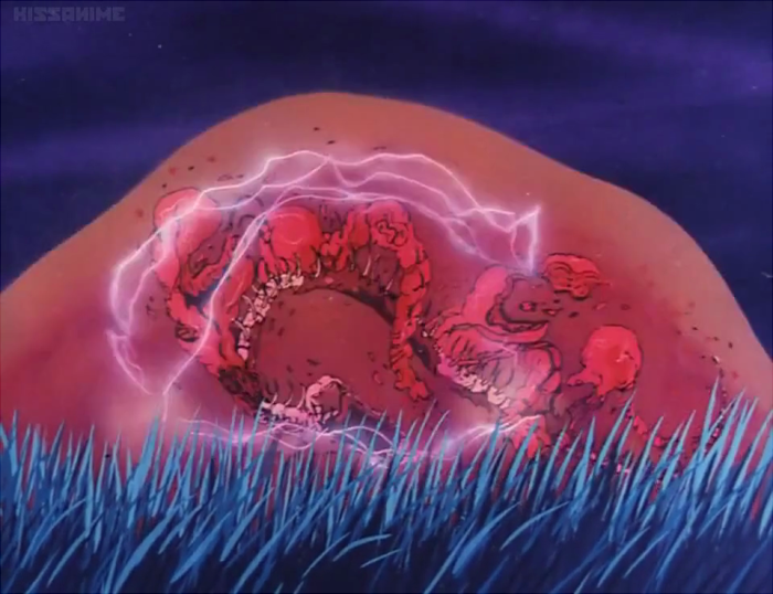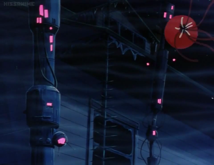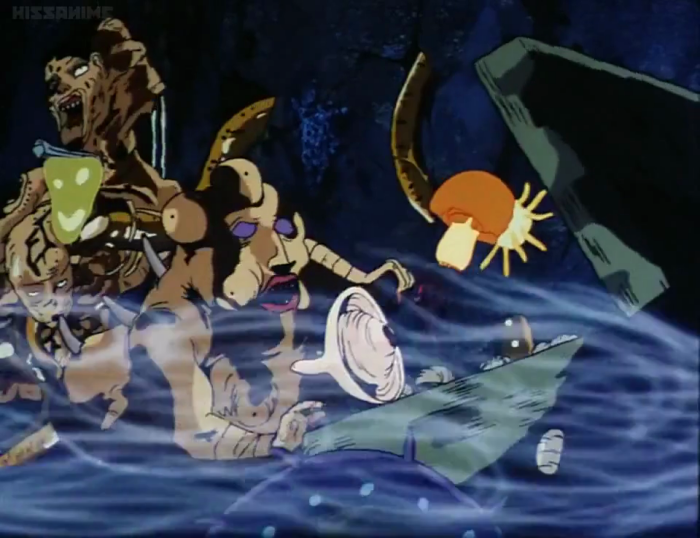 Later, for just a moment, we also glimpse some sort of jellyfish-like aerial organism, which unfortunately only exists to demonstrate the deadly disintegration field protecting the heroine's family home. It was always moments like these that tantalized me as a kid; I wanted to know what these things were, even if they were nothing more than momentary window dressing.