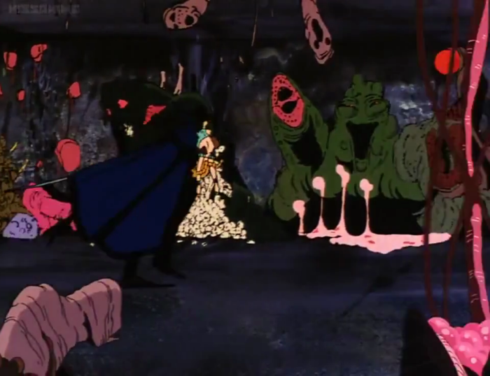 When D finally escapes back out the castle with the Damsel In Distress, he takes the same route back through the mutant-tunnel, and they actually bother to throw some new background weirdos at us. Enjoy the pterosaur-headed guy with a tumor for legs, a hairy snake with ears, a yellow slug, and a bunch of completely unidentifiable organic shapes, which as you know are among the best kind of organic shapes.