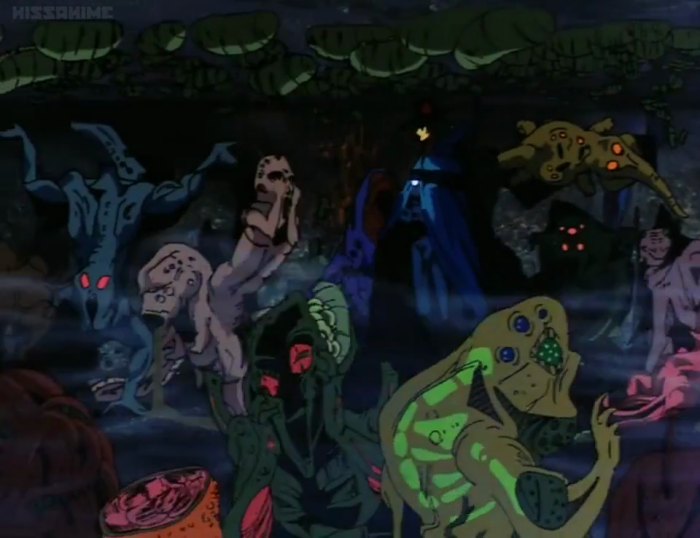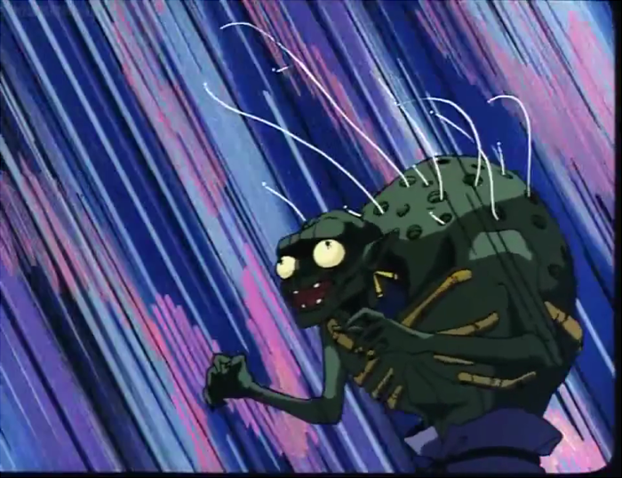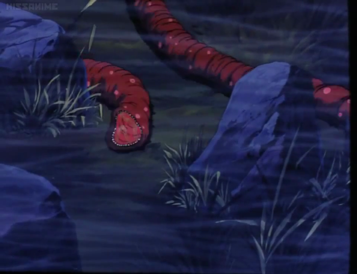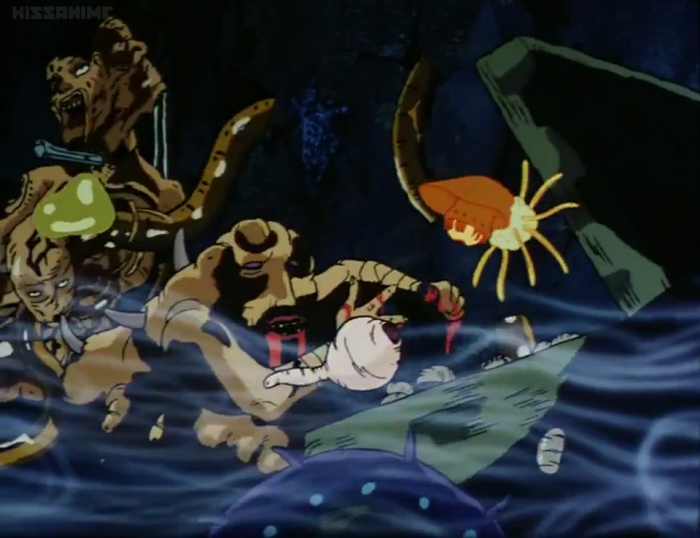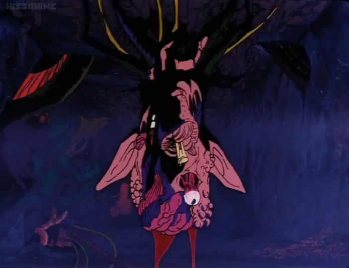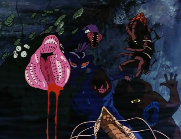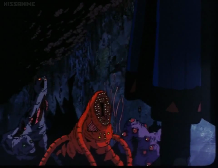 Next, a shot that really stood out in my memory, despite the fact that my old television turned most of these creatures into pitch black blots. All I could originally see were the various paler eyes, guts, and especially that massive pinkish lamprey-mouth. Now I can see that this sucker-faced monster has a fat, globular body, two whiplike antennae, and adorably diminutive arms.