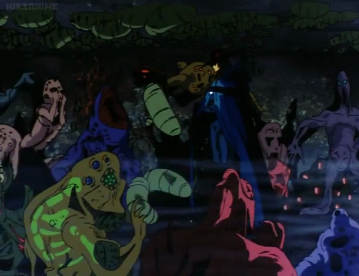 And DESPITE BEING a CLOUD OF GAS, D dispatches this one with another swing of his sword. This would have made even more sense to at least defeat with the air-sucking mutant hand, but no, D even has to be an overpowered, cocky asshole in the face of physical law by cutting a cloud to death.