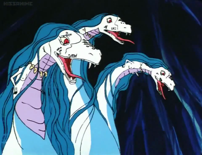 In fact, the three snake women - or perhaps a single, three-headed monster? - occupy a cave comprised entirely of just their ambulatory hair. They've got hundreds of times more hair than they seem to have anything else, though we never do find out how far their bodies (body?) actually go.