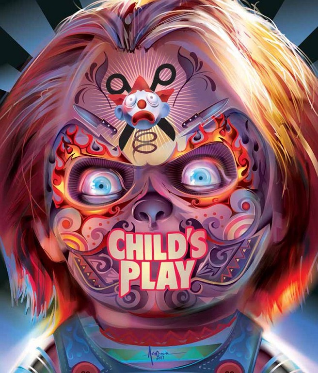 On the original film cover, Chucky is about to sever the head of a Jack-in-the-Box with scissors, and that's been turned into basically a Jolly Roger here, which is pretty clever. I like how the actual film titles are also basically the "teeth" here, which is repeated on a lot of these pieces.
