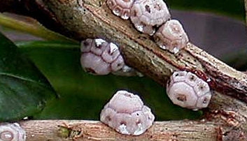 parasites. Attached to their host by a thick shell of their own waxy secretions, adult scale insects