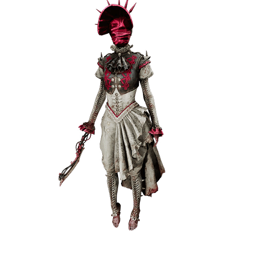 "HOPE SLAYER:" see?? Hope clearly isn't the only thing she's slaying here. Laced-up white leggings and matching sleeves with frilly red cuffs, a an asymmetrical white ballroom dress, black and white bodice with blood red embroidery, a black neck ruff and jabot (the poofy thing worn like a necktie), a head loosely but thickly wrapped in red velvet and another, entirely different style of even larger bonnet than her Lady Lunatic set, with a menacing arc of red nails impaled through its brim. Just positively sick.