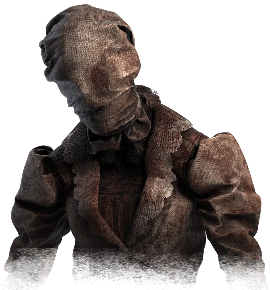 Her default design feels like a clear nod to Silent Hill, but I don't want to presume that every grimy, faceless horror nurse is a Bubblehead wannabe. Sally is still her own thing, and she only looks faceless because her head is all wrapped up in filthy cloth. The rest of her outfit is based on nurse uniforms from roughly a century ago, though it's a little frillier and fancier than I think most of them really were.
