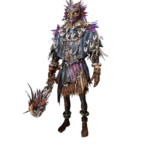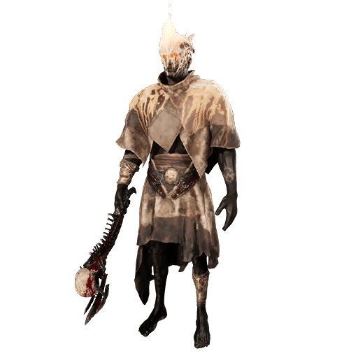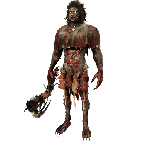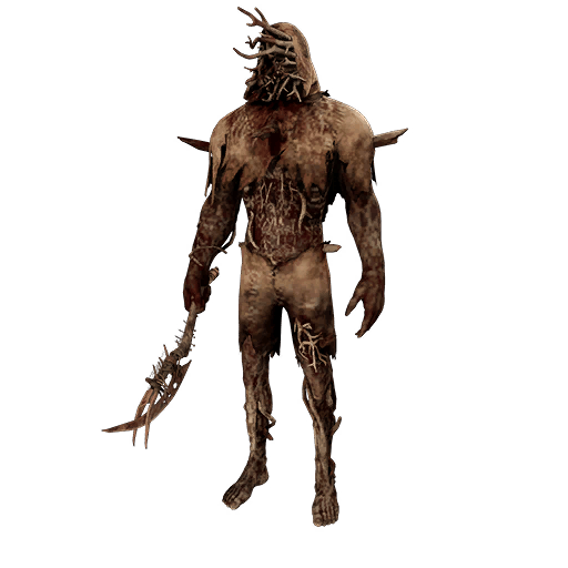 It's all much cooler and more intriguing lore than I went in expecting, but what's the angle here, as a killer? His aesthetic is vague, but certainly imposing. He's a tall, broad-shouldered figure, his upper body draped in layers of black leather and his limbs wrapped in dark bandages. His hook-shaped weapon is fashioned from a human skull and spinal cord, and his face, on close inspection, seems to be caked completely with mud and twigs, perhaps a kind of makeshift camouflage he resorted to back when he was kicking so much kickable ass.