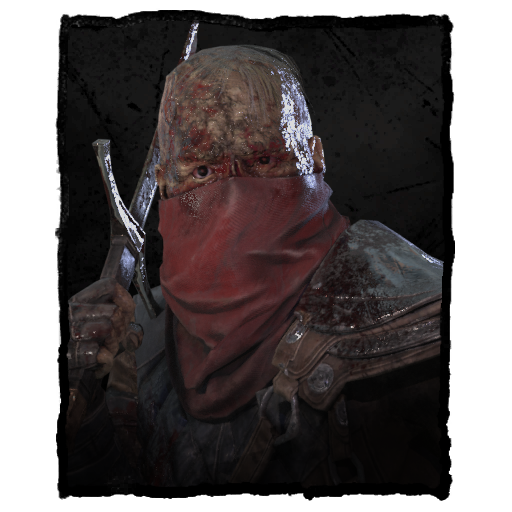"ASSASSIN" (Durkos Malecek) this guy can inflict survivors with a "deep wound" status effect, which progresses to the "dying" state where all they can do is crawl on the ground; same as when the Killer manages to hit them a couple times. The assassin appears to be burned all over, with corpsey flesh and barely any hair, wearing a red bandana over his nose and mouth.