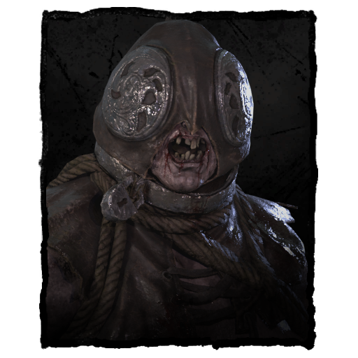 "CARNIFEX" (Sander Rault) a big burly guy with an axe, who can quickly break some of the objects survivors use to their advantage. Only his his lower face and rotten teeth can be seen through his heavy leather hood, which doesn't even have eye holes, but it does have two giant, circular metal emblems that give the impression of huge eyes, and together with the pointed tip of the hood where his nose is, it kind of gives him a big owl-like face.