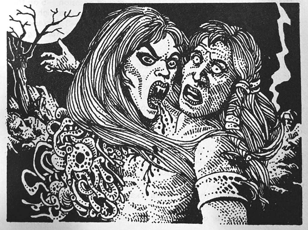 My introduction to this type of ghoul was actually in the original Advanced Dungeons and Dragons Fiend Folio, with its entry on Malaysia's Penanggalan, which both fascinated and nauseated me as a small child who could not at all handle anything to do with guts coming out of things. So much so, I actually made my mother cut the Penanggalan out of the book for me, but I wanted to preserve the adorable bug creature on the opposite page, and I still have that very book because I use it to rest my laptop on when I'm in bed:
