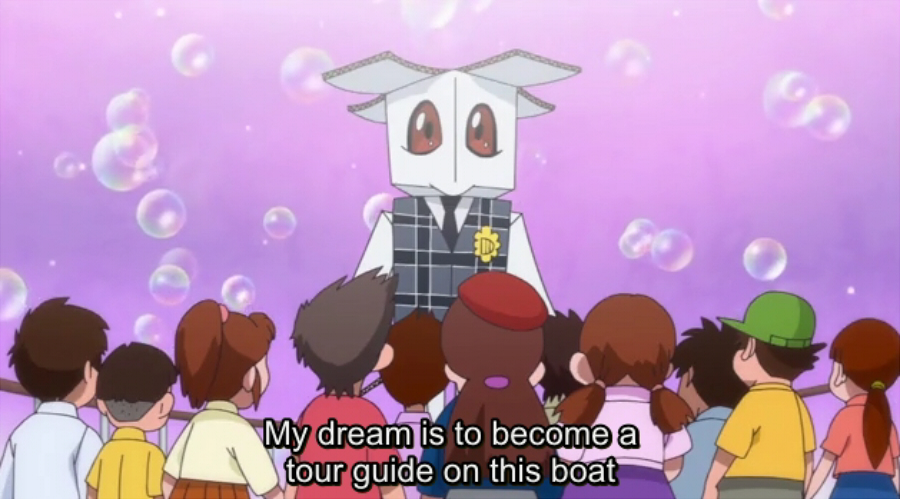 One word: sublime. This is the unequivocal zenith of digimon design. It cannot, has not, will never get better than these cardboard boxes in the shape of a little dude. Not even any other conceivable little dude of cardboard boxes could ever exceed the splendor on display here. The fact that it offers a cute digimon kitty-cat eye on one side but a terrifying bakemono's eye on the other. How the top of the box head is open but we don't get to see what's even in there, if anything. The one random box that's gift-wrapped. The duct tape. The dents that evoke "teeth."