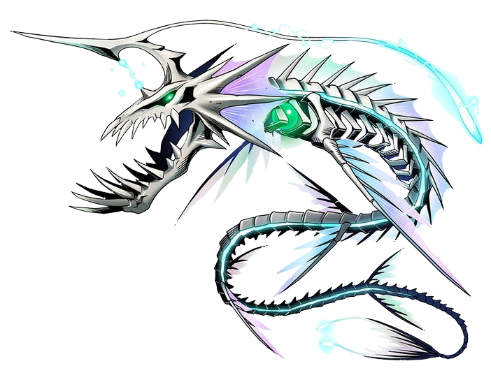As an undead perfect level, it serves as the "skullgreymon" of the sea, a long slinking fish skeleton with a similar long-jawed skull to its terrestrial cousin, which in this context evokes the skull of a deep-sea predator. Naturally, it also has a long, whiplike illicium with a bioluminescent tip, trailing from the blade-like horn on its head!