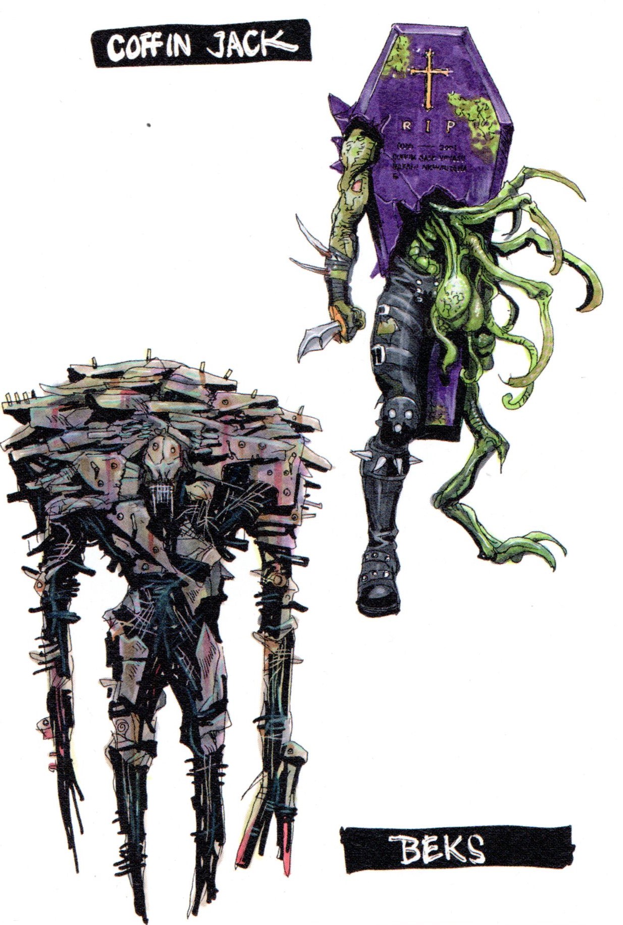 Presented all alone in the book, rather than paired with another monster, so I assume there's something special about voco? They're a huge corpulent green-tinged ghoul, reminiscent of something from Warhammer's Nurgle armies, with an elaborate cenobite-like black leather outfit; lots of gratuitous straps and spikes and metal bolts. Voco carries baskets full of skulls on their back, and if those are human-sized skulls, Voco would be more than a hundred feet tall, but somehow also hovering above the ground with footless, metal spikes for legs.