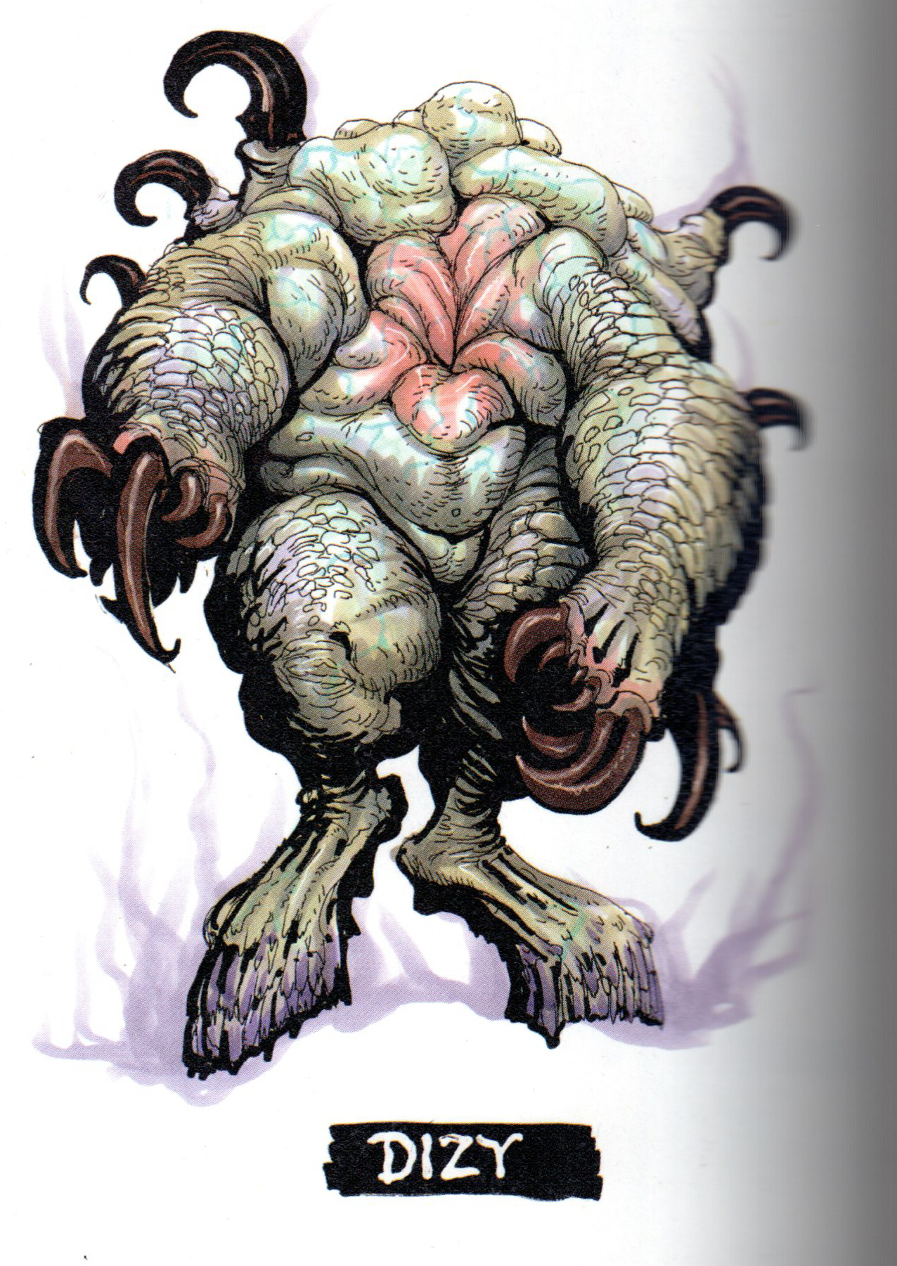 This is such an ominous and frightening beast, a headless and faceless blob of veiny, lumpy flesh with an unpleasantly sucked-in, knotlike center where its tissues look pinker and more inflamed. Its massively blubbery arms and legs have almost crocodilian scales, its hands are just clots of random talons and its feet are like cracked, broken-off bony hooves. Why is its name just "Dizy!?" Is it dizzy!? I don't want this to be dizzy. This is one of the worst things to be dizzy.