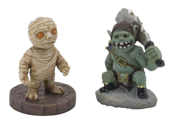 These two tiny figures are for Halloween village displays, but what a fascinating selection! An orc or ogre sort of character with a mace, and a squat mummy with a very bizarre face, its solid orange pupil-less eyeballs and upturned nose looking more like a UFO alien than a human mummy! I like its brickwork base, too. Both of these look very much like miniatures for a fantasy RPG.Eyeball Brew