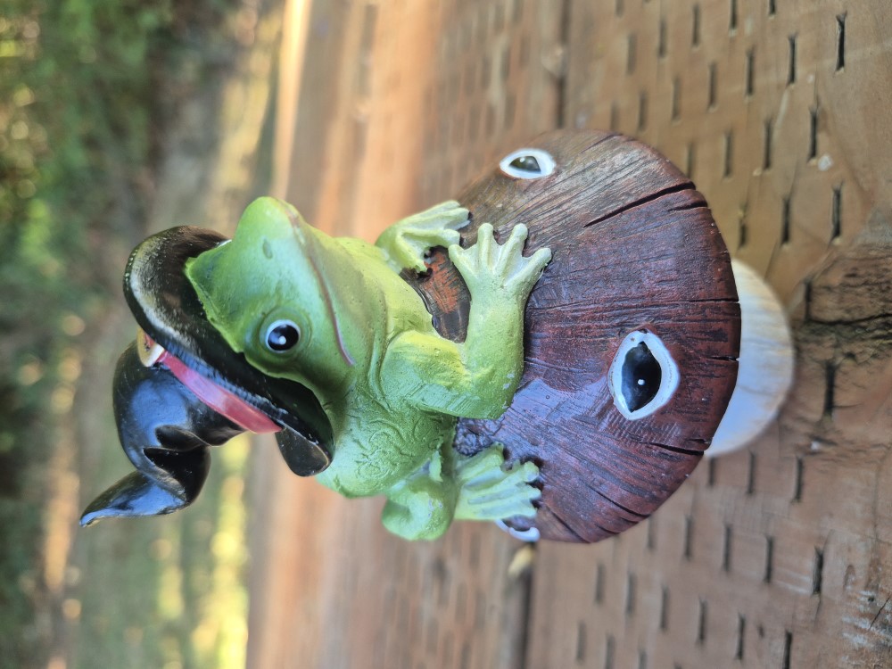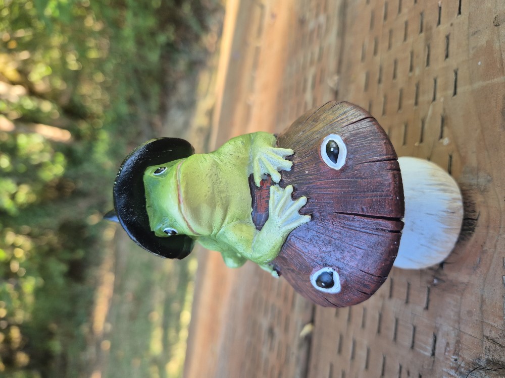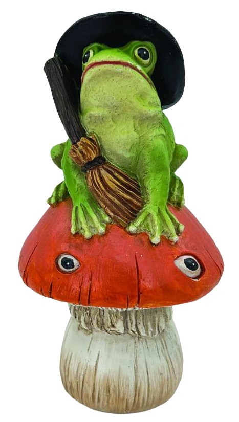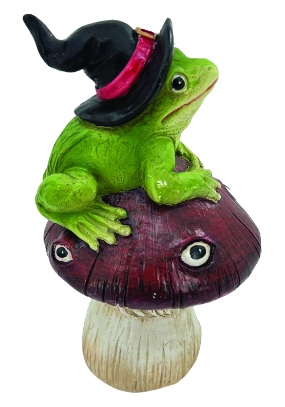 A melted gooey skull which is finally green, thank goodness, but it's unfortunately over $40. To be fair, that's because it's also a light-up mini fog machine that talks! Love the unsettling choice of dialog, too. "What did I fall into? I can't feel my body." Don't worry dude. You're gonna be fine. Honest.Witch Frogs on Mushroom Creatures?!