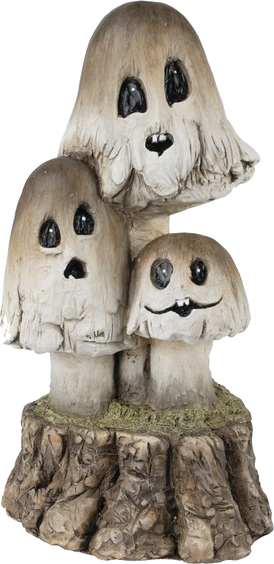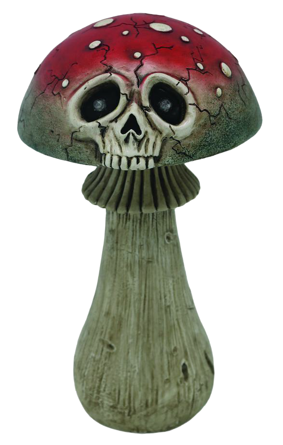 ANOTHER FUNGUS. This one is a detailed statue of an amanita-colored mushroom, but the cap is also made of cracked bone with the eye sockets, nose and upper teeth of a skull growing out of it. RAD!Ghostshroom trio!
