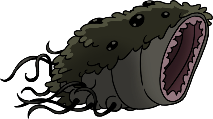 A simple, limbless worm with a circular arrangement of teeth and a pleasingly armor-plated body of nested segments. A very straightforward design that's been done plenty of times before, but feels cool every time it reappears, and what makes the sandcarver really stand out is its population density; it's not so much an enemy as an environmental feature, since they seem to occupy every square inch of their biome's sandy floor in a writhing, gnashing mass that functions basically the same as a pit of acid or magma.